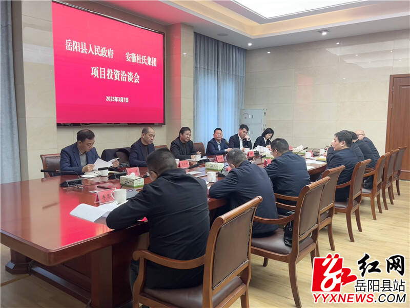 嶽陽縣融媒體中心3月10日訊(記者 付琴 周星亮)3月7日,我縣與安徽杜氏集團召開項目投資洽談會,縣委副書記、縣長吳光文,副縣長張文毅,安徽杜氏集團董事長杜永新出席,政企代表們共聚一堂,圍繞重點產業項目合作進行深入交流並達成初步共識。