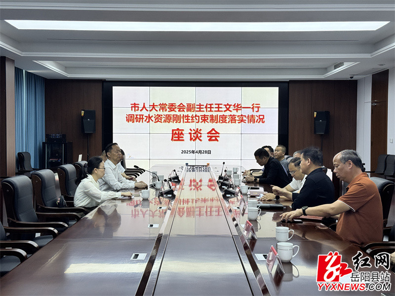 嶽陽縣融媒體中心4月29日訊(尹宇豪)4月28日,市人大常委會副主任王文華率隊來我縣調研水資源剛性約束製度落實情況,縣人大常委會主任、黨組書記周峰,縣人大常委會副主任任三星及市、縣相關部門和鄉鎮負責人參加。