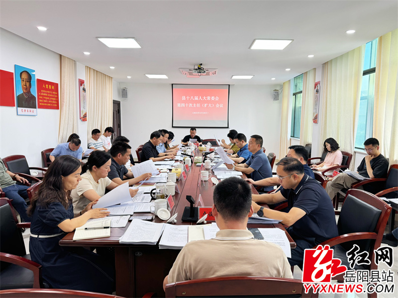 嶽陽縣融媒體中心5月20日訊(周昱君)5月20日,縣人大常委會主任、黨組書記周峰主持召開縣十八屆人大常委會第四十次主任(擴大)會議,黨組副書記、副主任王衛兵,副主任彭碧芳、胡秉陽、吳承棉、任三星參加。