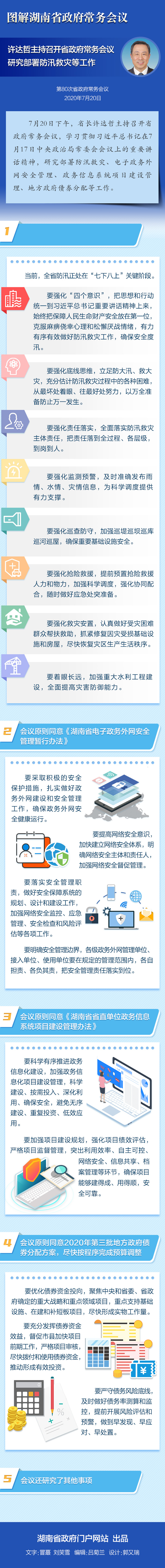 7月20日下午,省長許達哲主持召開省政府常務會議,學習貫徹習近平總書記在7月17日中央政治局常委會會議上的重要講話精神,研究部署防汛救災、電子政務外網安全管理、政務信息係統項目建設管理、地方政府債券分配等工作。