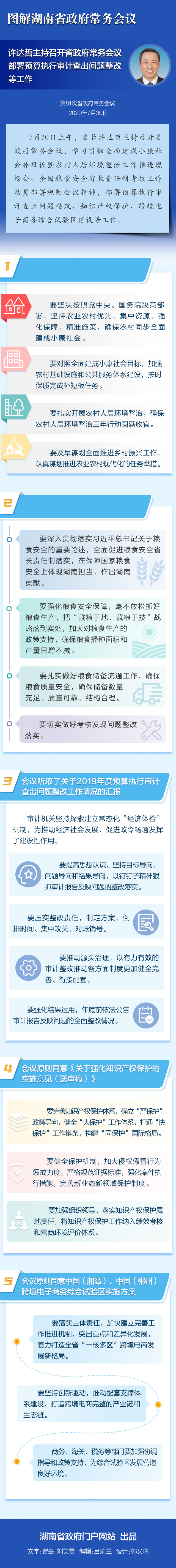 7月30日上午,省長許達哲主持召開省政府常務會議,學習貫徹全麵建成小康社會補短板暨農村人居環境整治工作推進現場會、全國糧食安全省長責任製考核工作動員部署視頻會議精神,部署預算執行審計查出問題整改、知識產權保護、跨境電子商務綜合試驗區建設等工作。