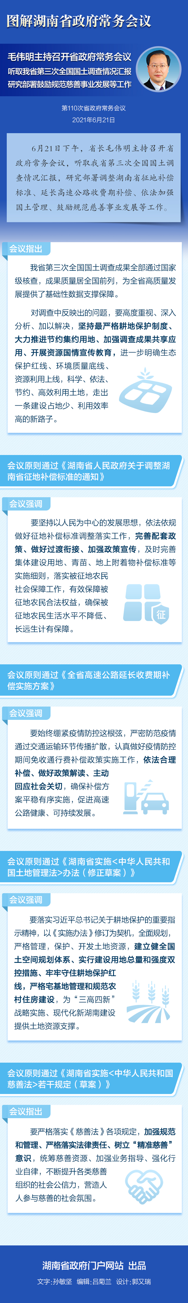 6月21日下午,省長毛偉明主持召開省政府常務會議,聽取我省第三次全國國土調查情況匯報,研究部署調整湖南省征地補償標準、延長高速公路收費期補償、依法加強國土管理、鼓勵規範慈善事業發展等工作。