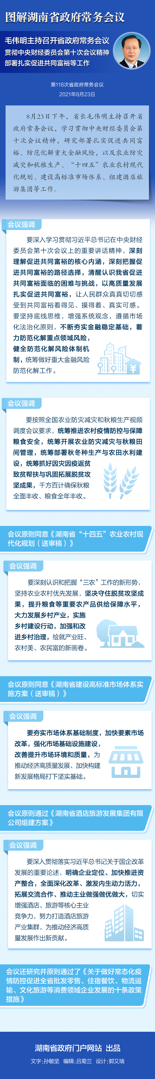 8月23日下午,省長毛偉明主持召開省政府常務會議,學習貫徹中央財經委員會第十次會議精神,研究部署紮實促進共同富裕、防範化解重大金融風險,以及農業防災減災和秋糧生產、“十四五”農業農村現代化規劃、建設高標準市場體係、組建酒店旅遊集團等工作。