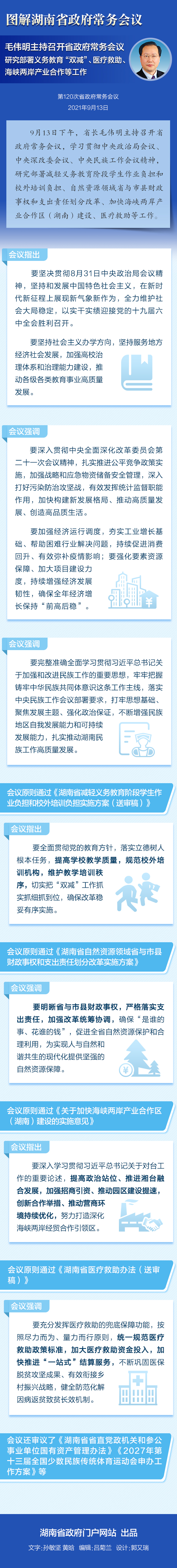 9月13日下午,省長毛偉明主持召開省政府常務會議,學習貫徹中央政治局會議、中央深改委會議、中央民族工作會議精神,研究部署減輕義務教育階段學生作業負擔和校外培訓負擔、自然資源領域省與市縣財政事權和支出責任劃分改革、加快海峽兩岸產業合作區(湖南)建設、醫療救助等工作。