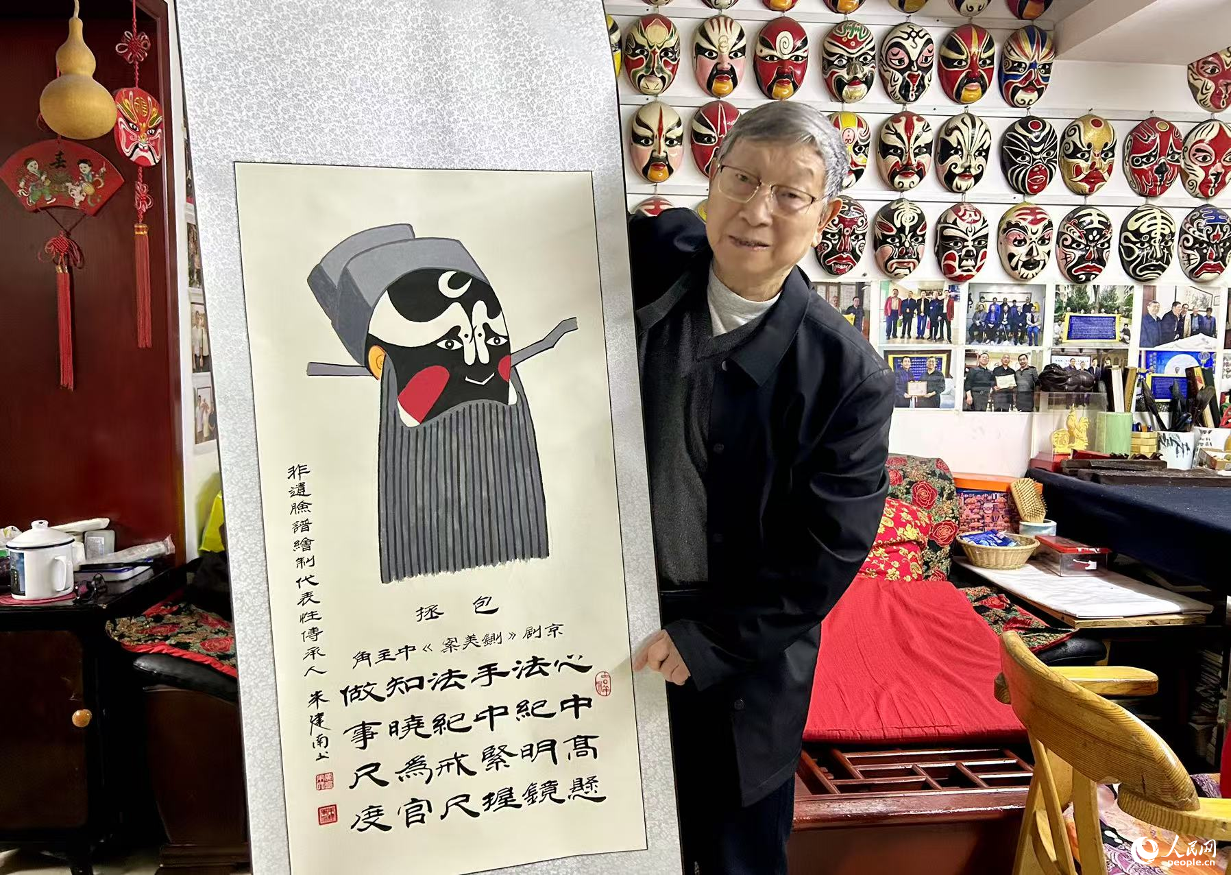 朱建南與他的《包拯臉譜係列作品》(其一)。人民網 劉汕攝