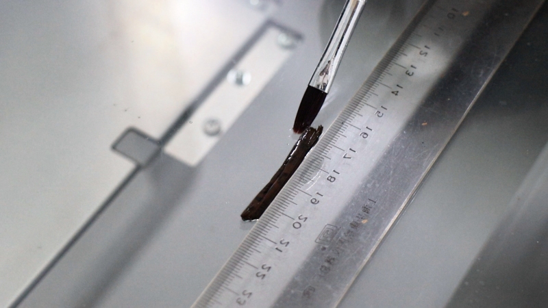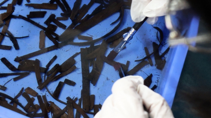 用毛筆輕輕清洗殘簡。楊思穎攝