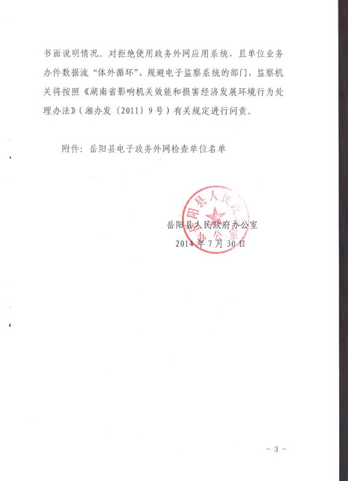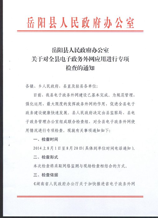 嶽陽縣人民政府辦公室關於對全縣電子政務外網應用進行專項檢查的通知