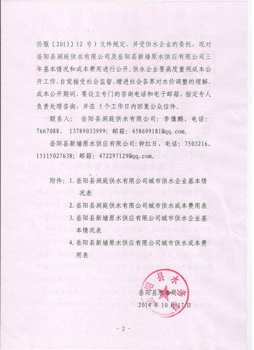 嶽陽縣洞庭供水有限公司及嶽陽縣新牆原水供應有限公司近三年基本情況和成本費用公告