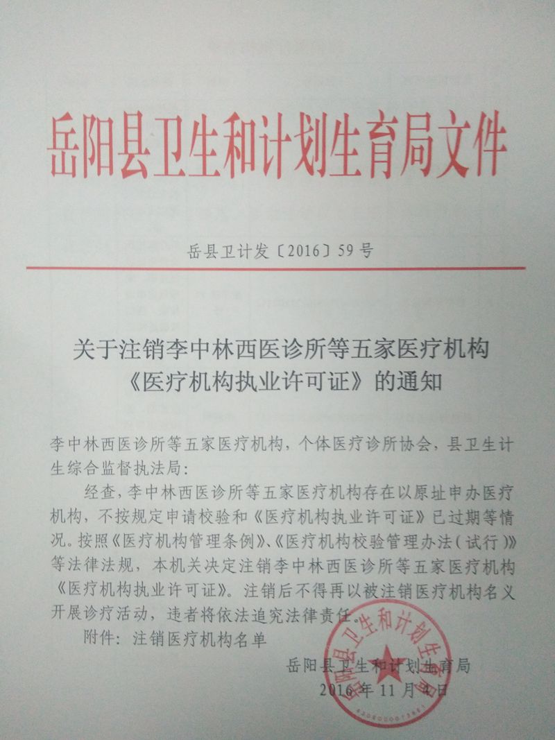 關於注銷李中林西醫診所等五家醫療機構 《醫療機構執業許可證》的通知