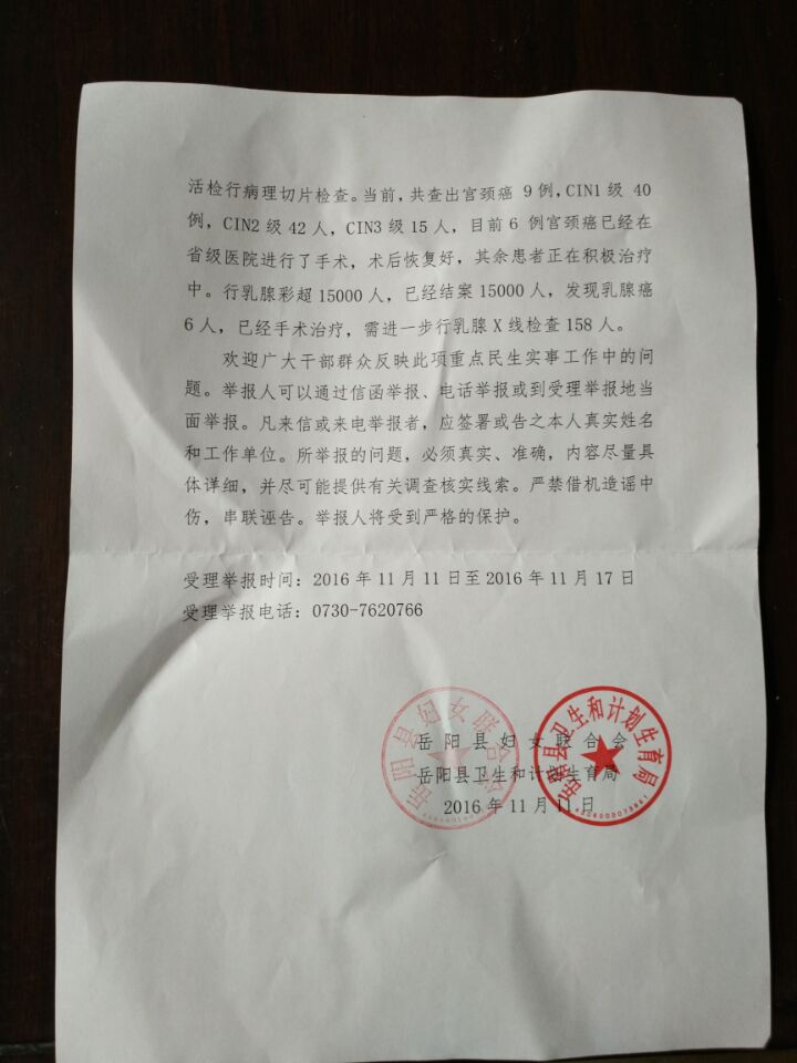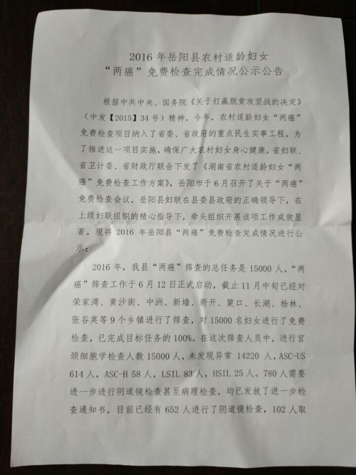 2016年嶽陽縣農村適齡婦女“兩癌”免費檢查完成情況公示公告