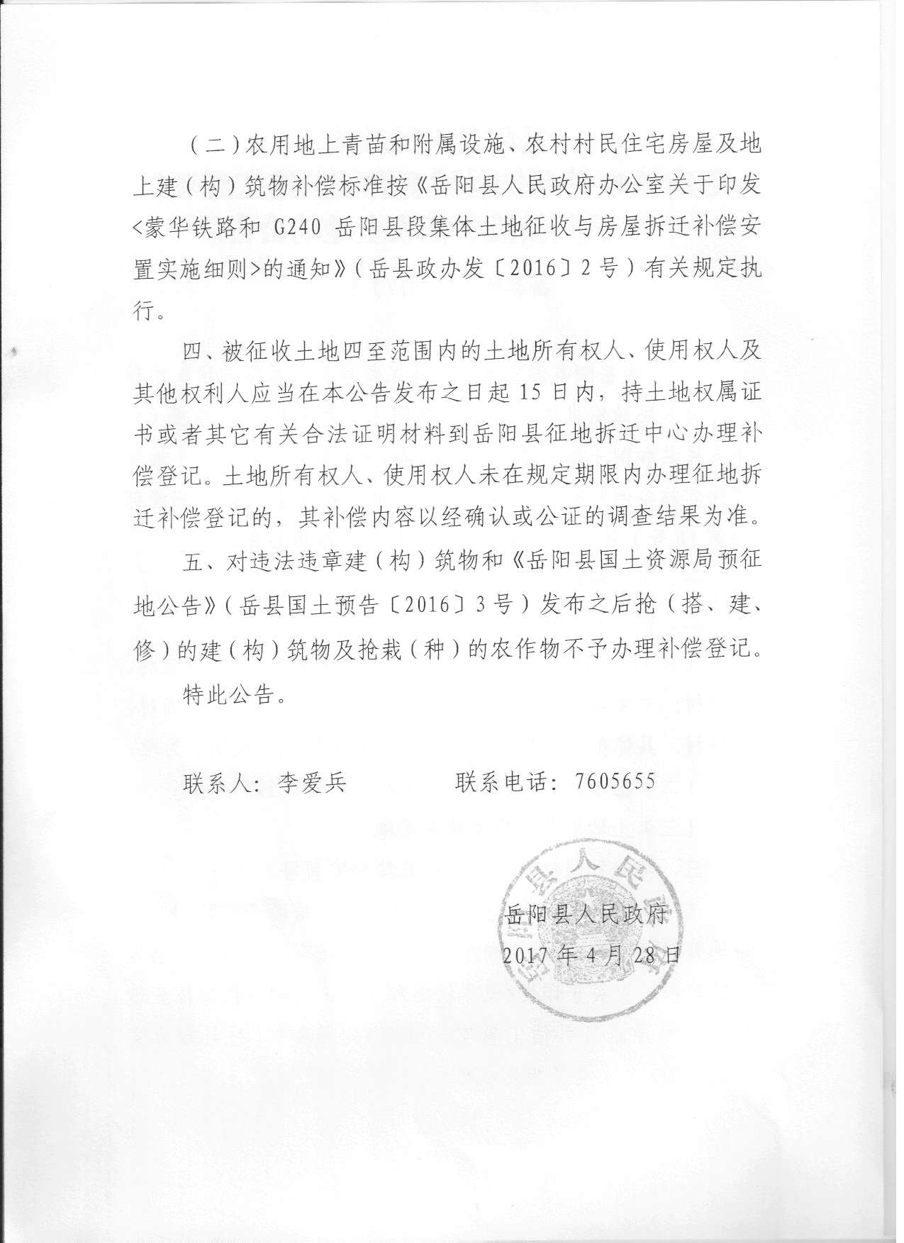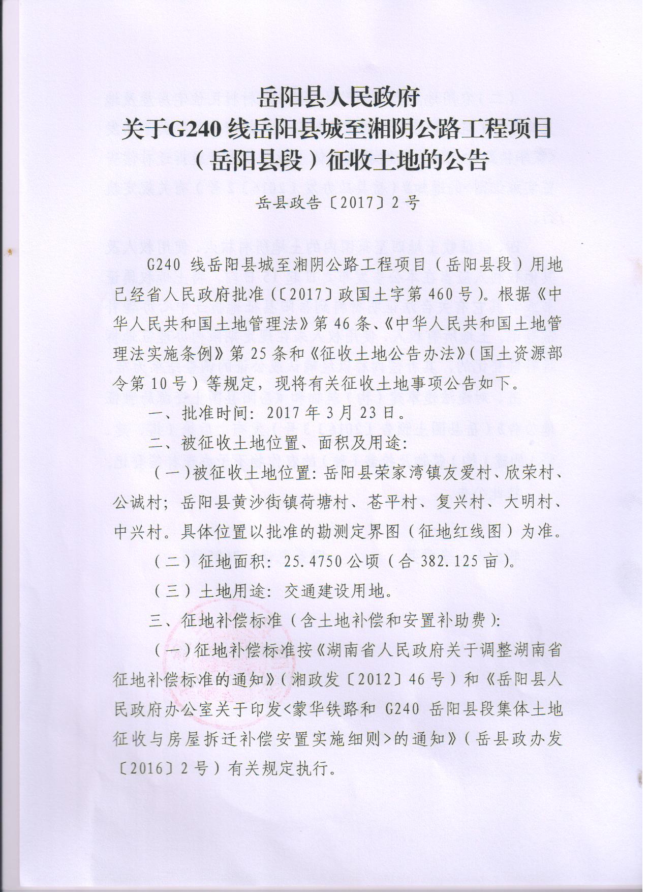 嶽陽縣人民政府關於G240線嶽陽縣城至湘陰公路工程項目(嶽陽縣段)征收土地的公告