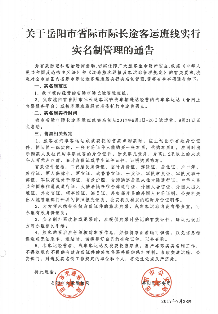 關於嶽陽市省際市際長途客運班線實行實名製管理的通告