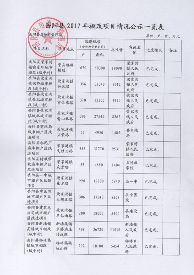 嶽陽縣2017年11月棚改項目情況公示一覽表