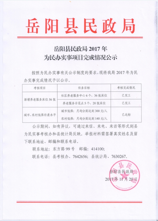 嶽陽縣民政局2017年為民辦實事項目完成情況公示