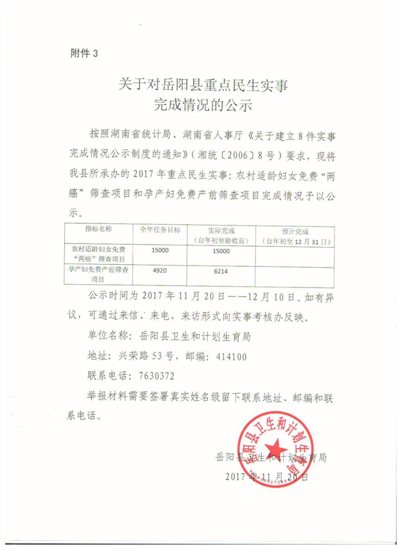 關於對嶽陽縣衛計局重點民生實事完成情況的公示