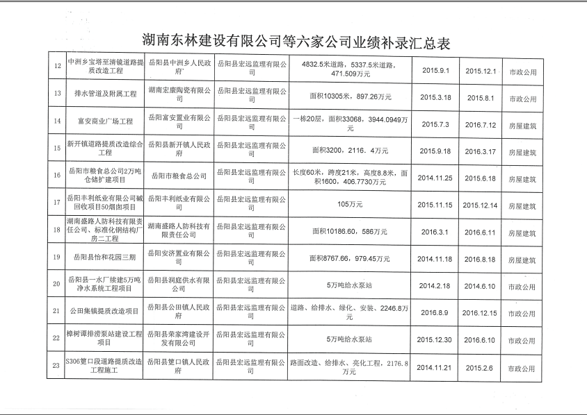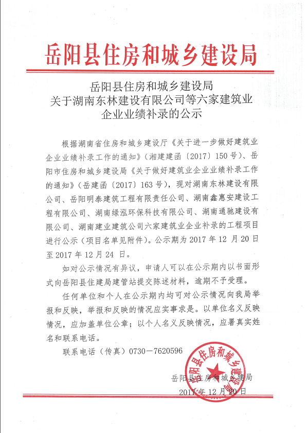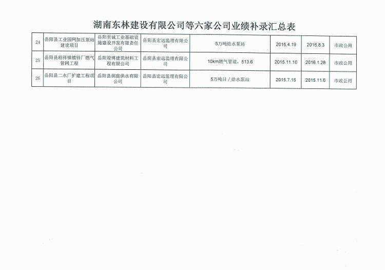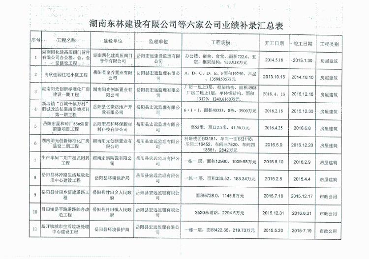 關於湖南東林建設有限公司等六家建築業企業業績補錄的公示