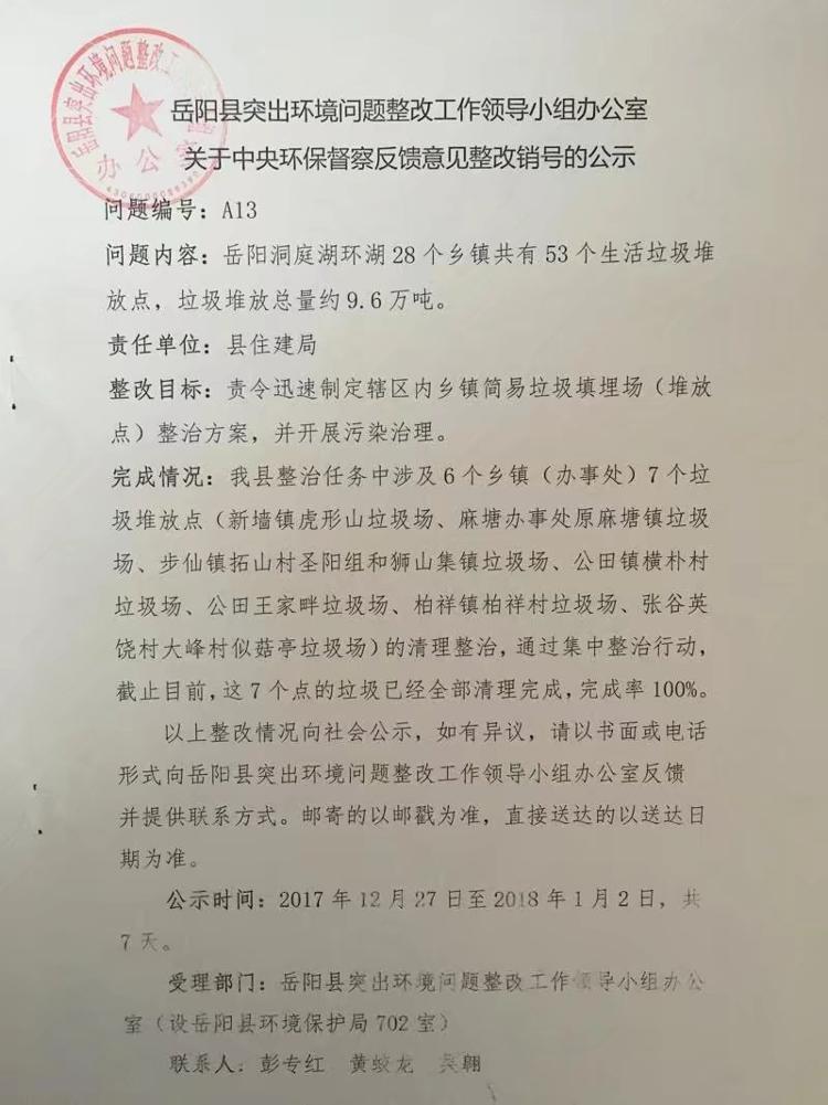 嶽陽縣突出環境問題整改工作領導小組辦公室關於中央環保督察反饋意見整改銷號的公示A13