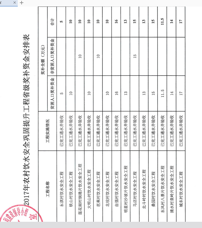 2017年扶貧農村飲水安全鞏固提升工程省級獎補資金安排