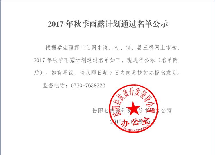 嶽陽縣2017年秋季雨露計劃通過名單公示