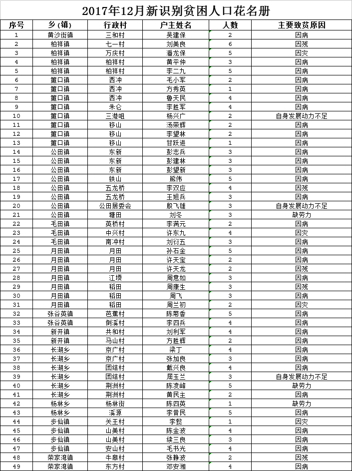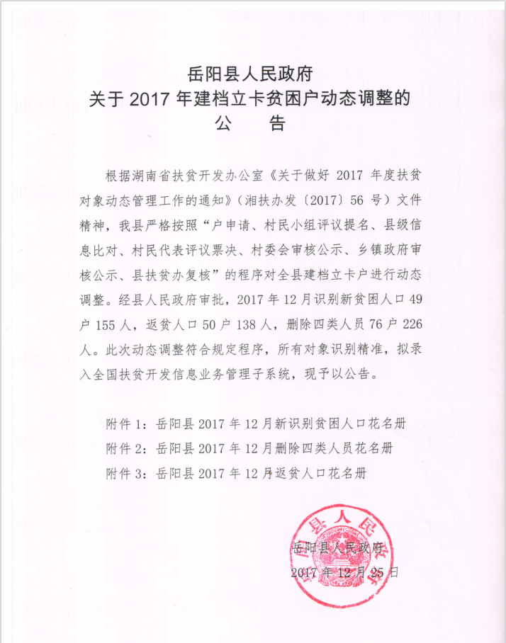嶽陽縣人民政府關於2017年12月份建檔立卡貧困戶動態調整的公告