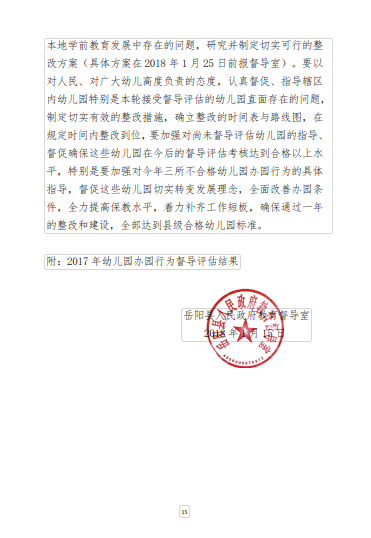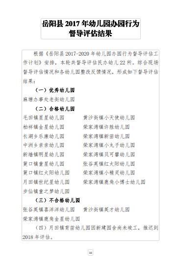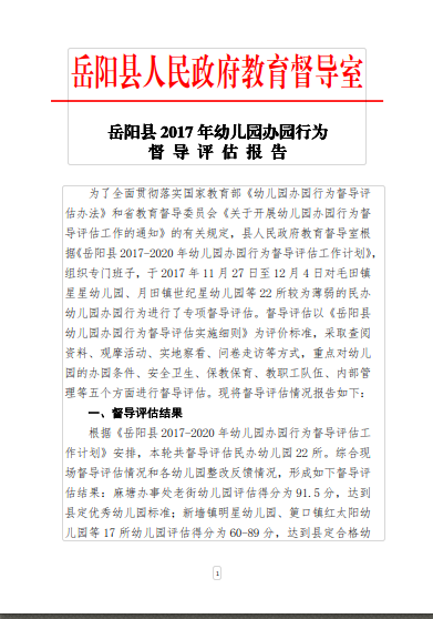 嶽陽縣2017年幼兒園辦園行為督導評估報告