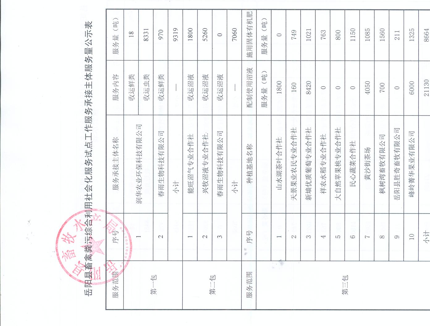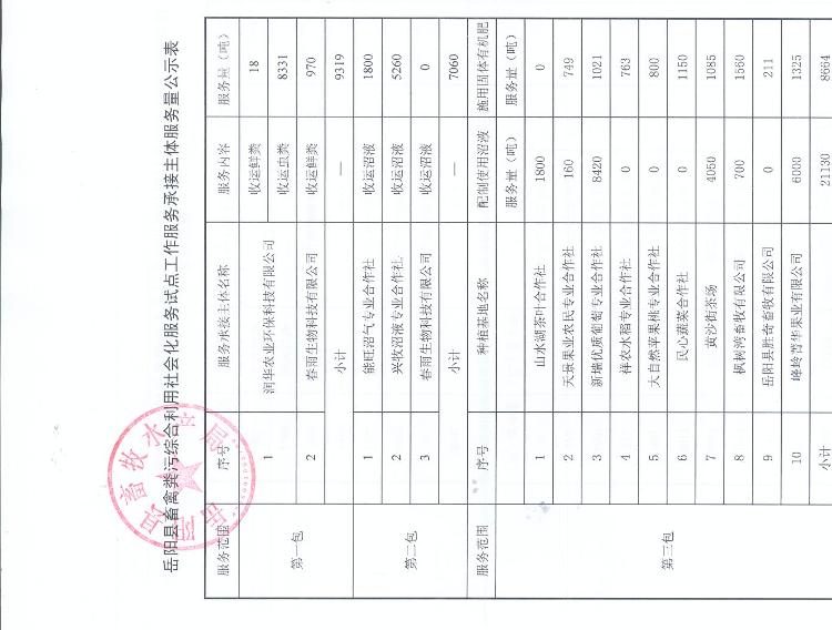 附:嶽陽縣畜禽糞汙綜合利用社會化服務試點工作服務承接主體服務量公示表