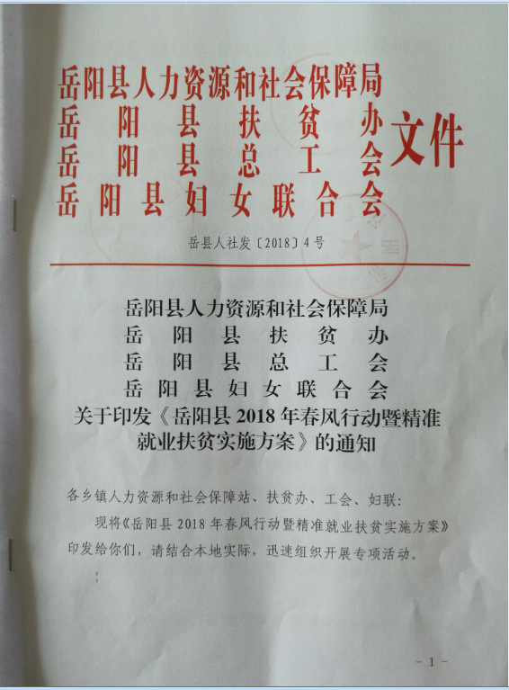 關於印發《嶽陽縣2018年春風行動暨精準就業扶貧實施方案》的通知