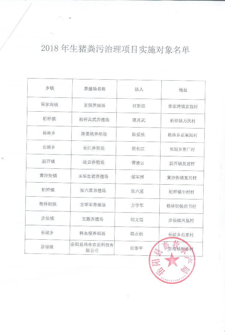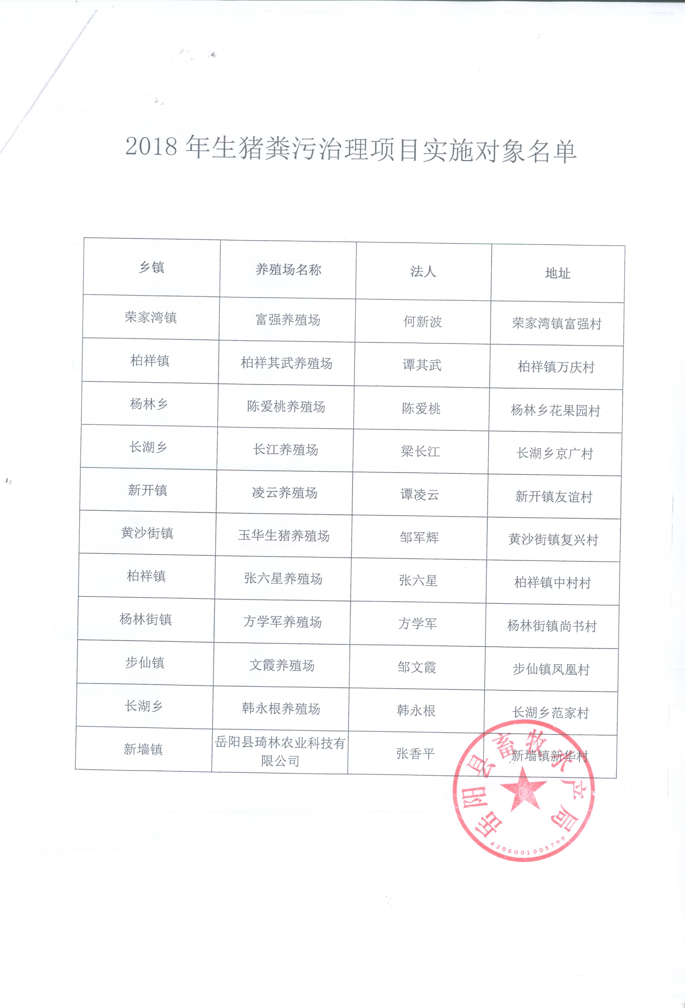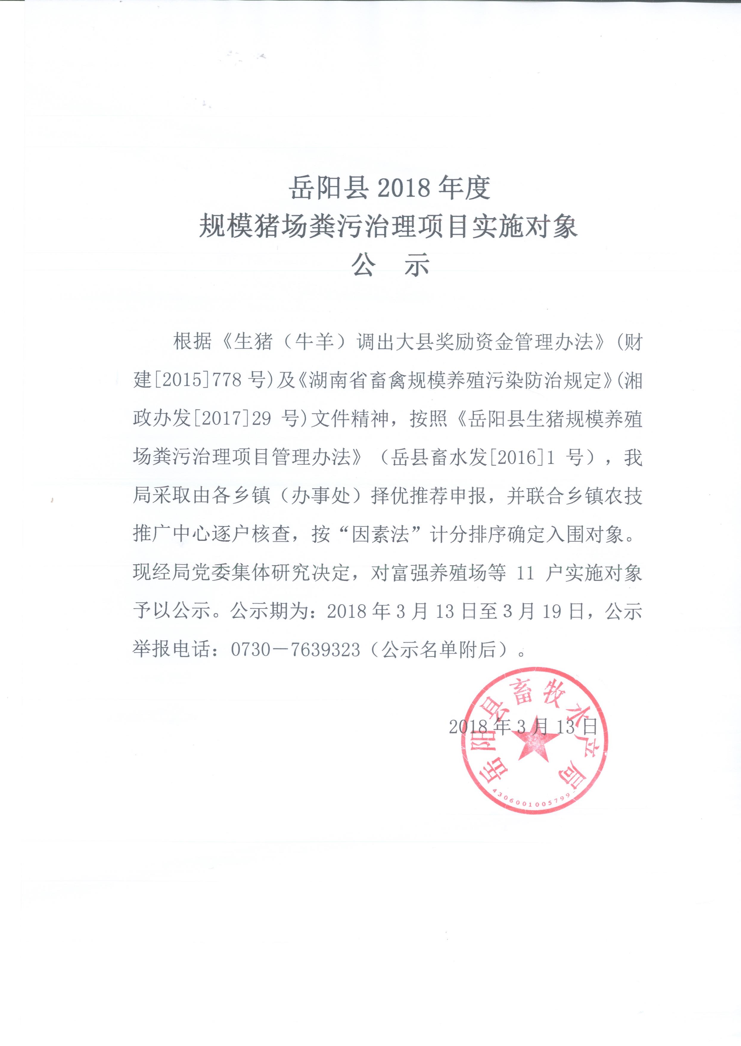 嶽陽縣2018年度規模豬場糞汙治理項目實施對象公示