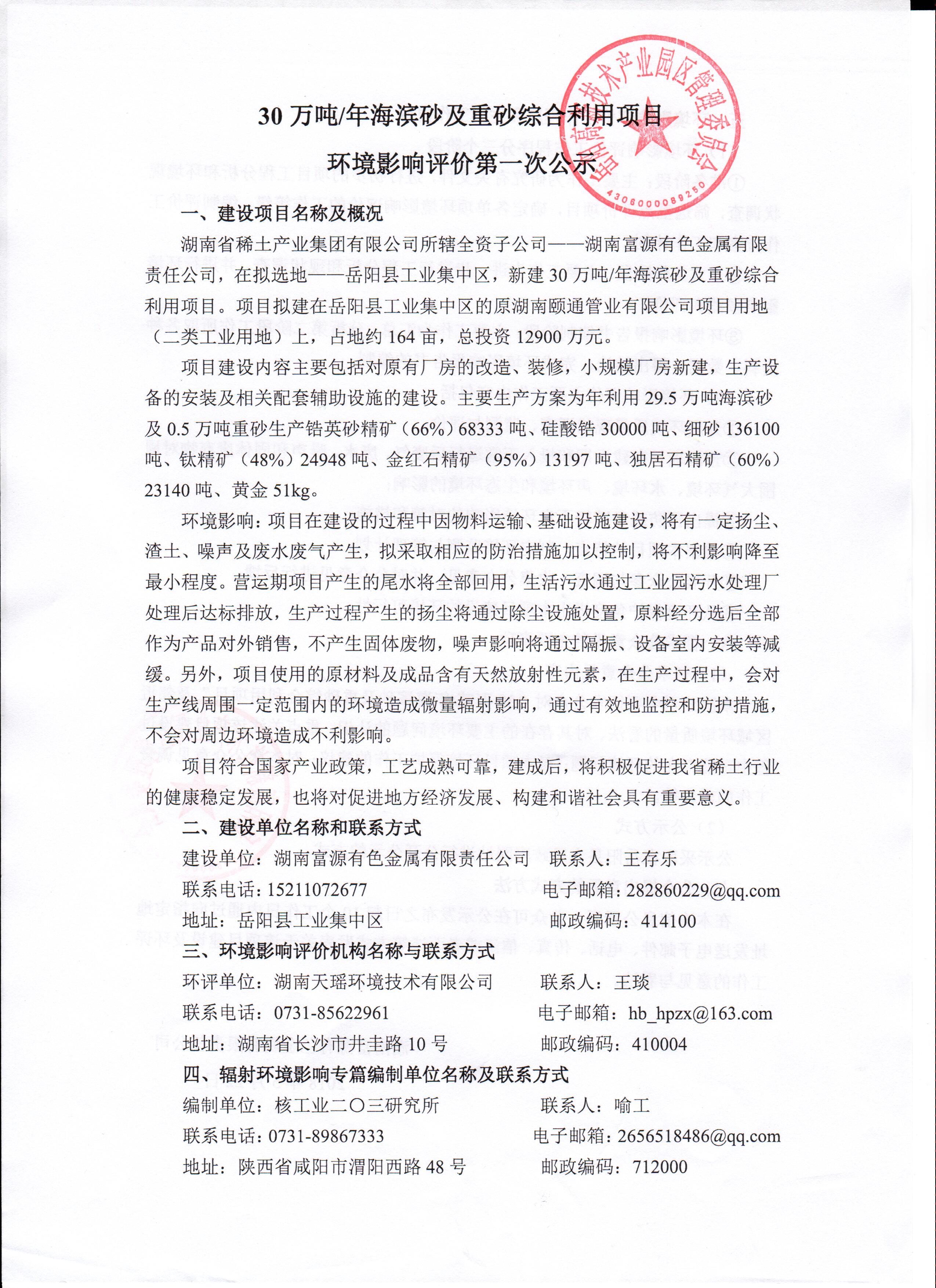 30萬噸/年海濱砂及重砂綜合利用項目環境影響評價第一次公示