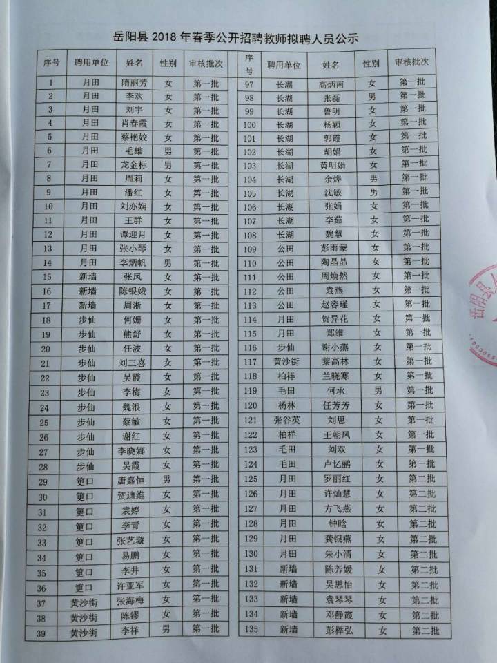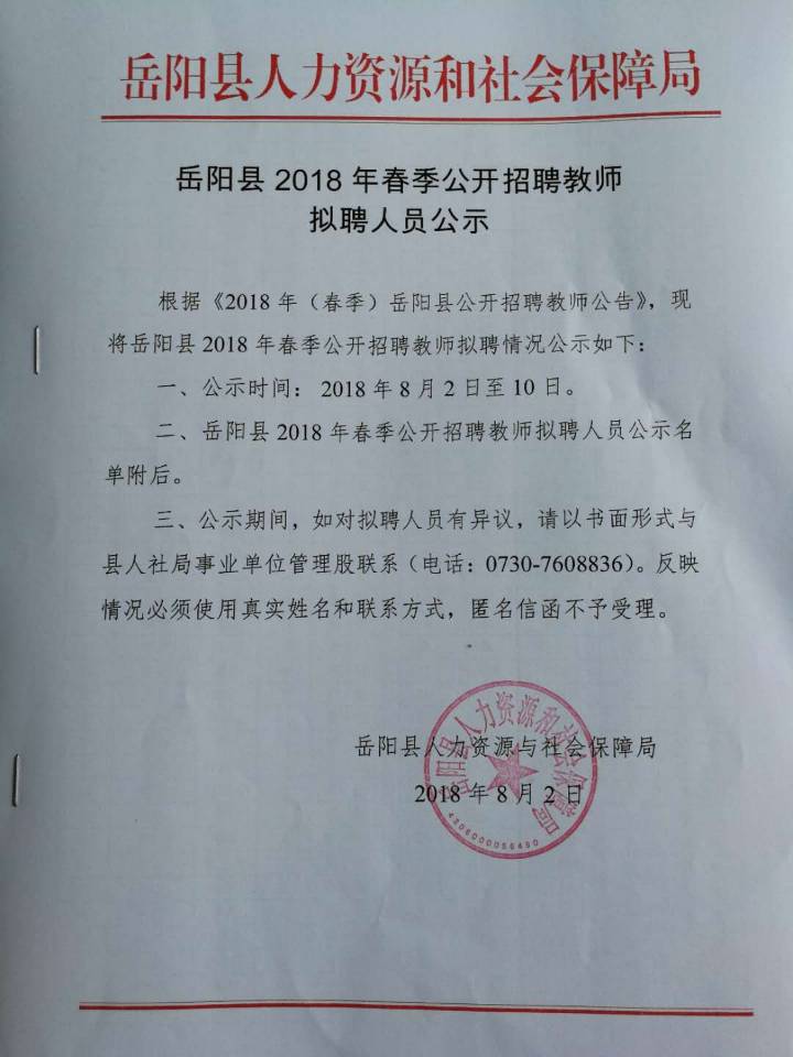 嶽陽縣2018年春季公開招聘教師 擬聘人員公示