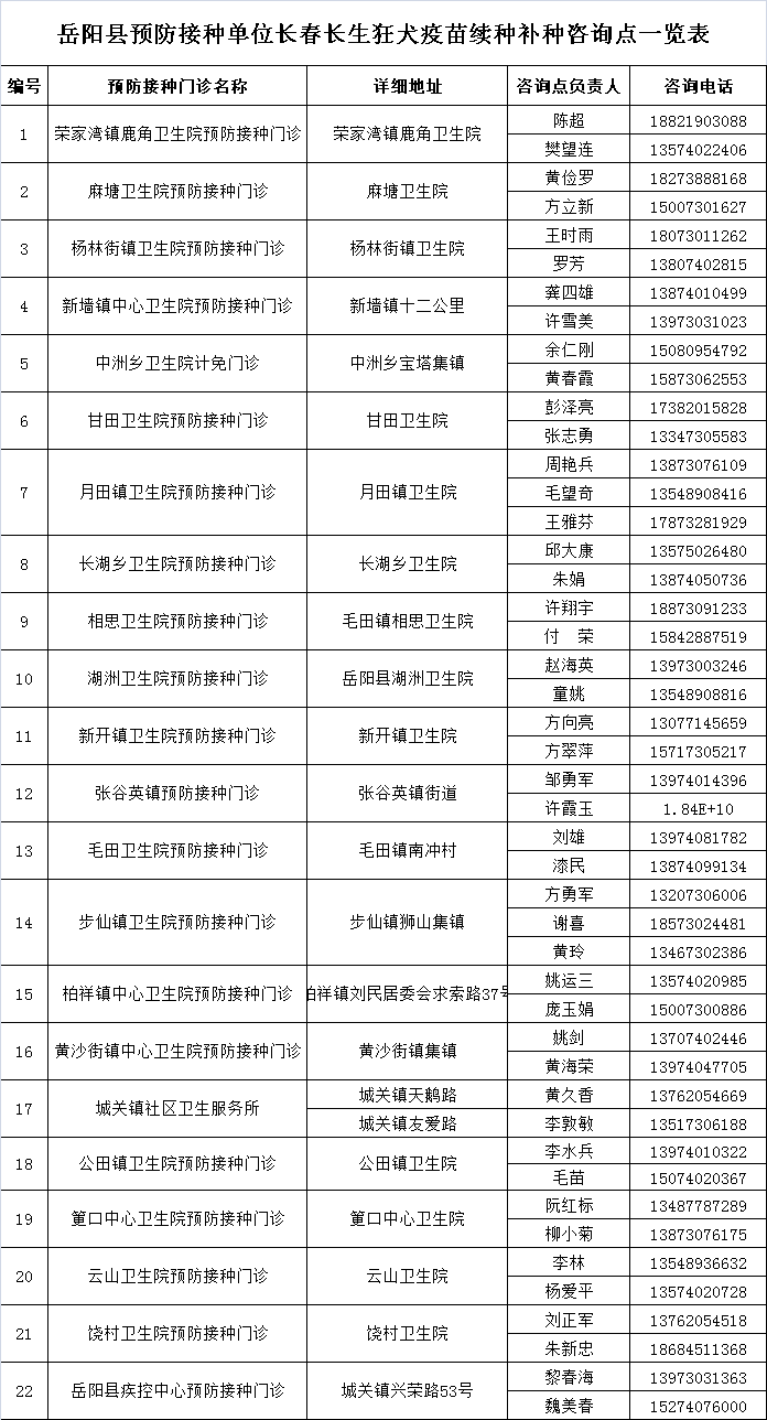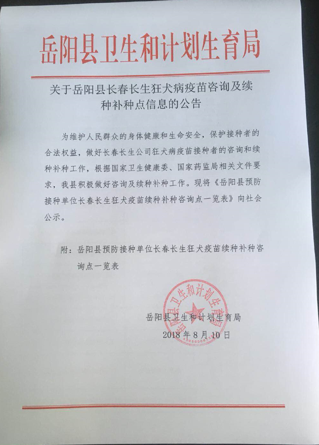 關於嶽陽縣長春長生狂犬病疫苗谘詢及續種補種點信息的公告