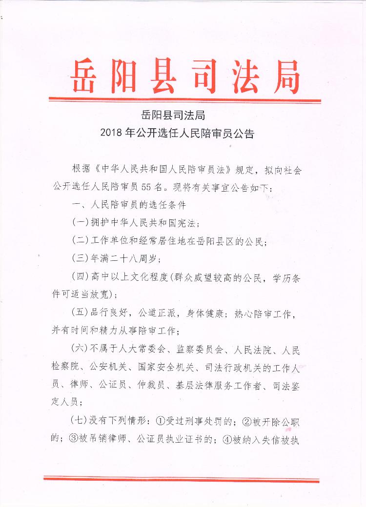 嶽陽縣司法局2018年公開選任人民陪審員公告