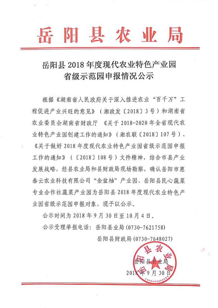嶽陽縣2018年度現代農業特色產業園省級示範園申報情況公示