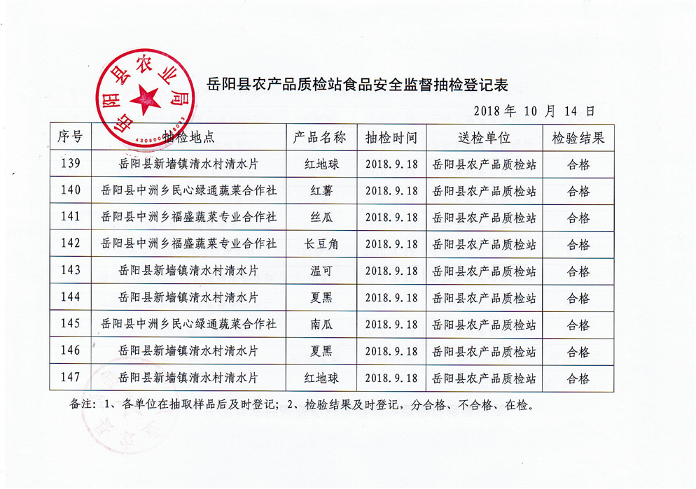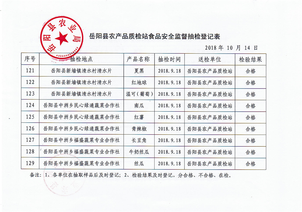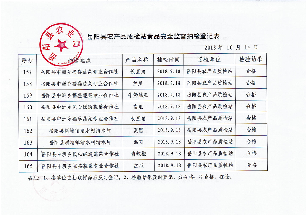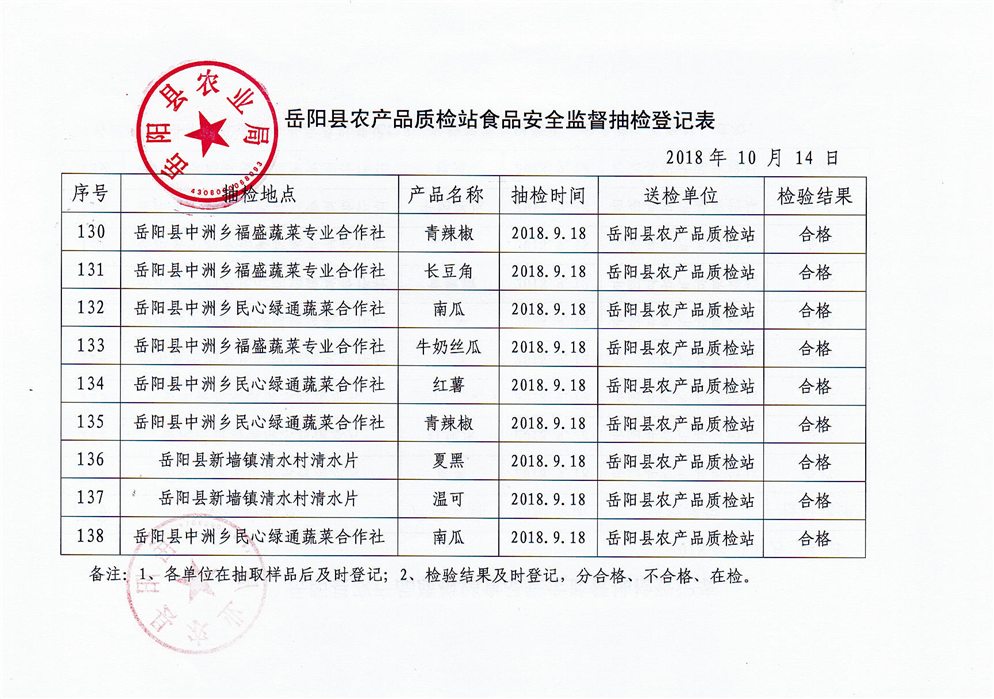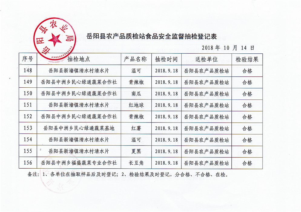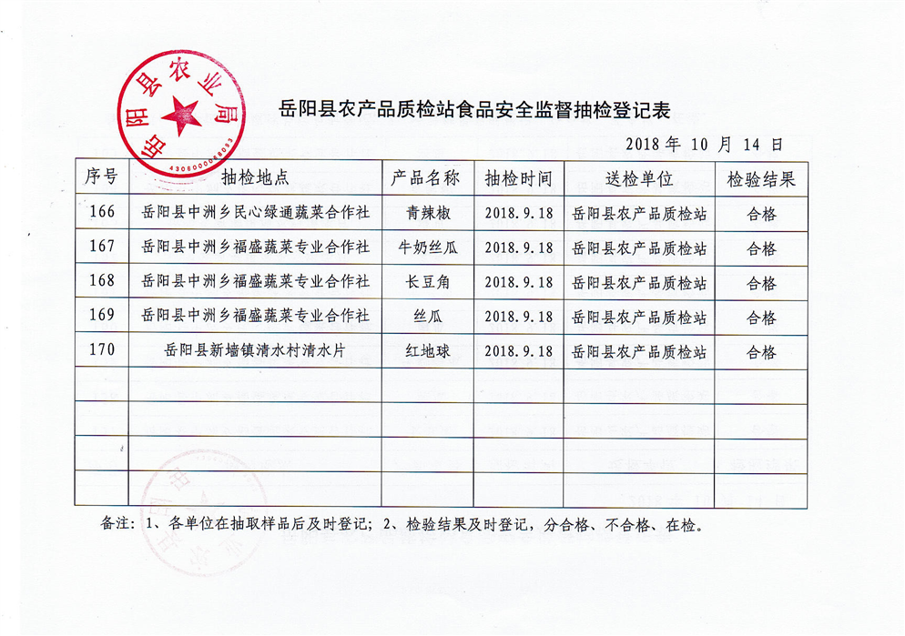 嶽陽縣農產品質檢站食品安全監督抽檢登記表2