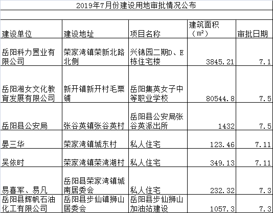 2019年7月份建設用地審批情況公布