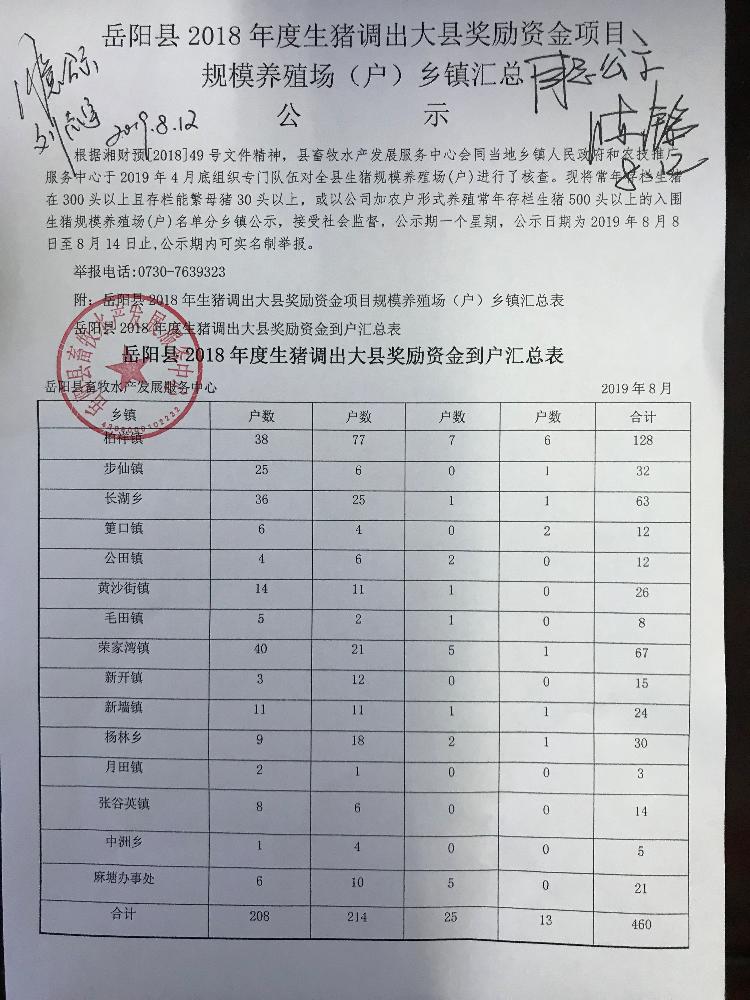 嶽陽縣2018年度生豬調出大縣獎勵資金項目規模養殖場(戶)鄉鎮匯總公示