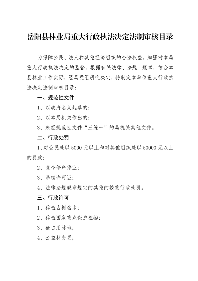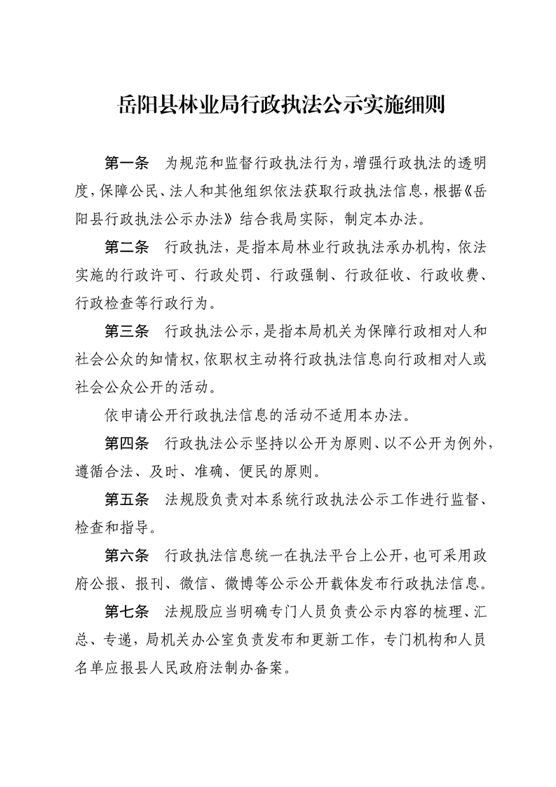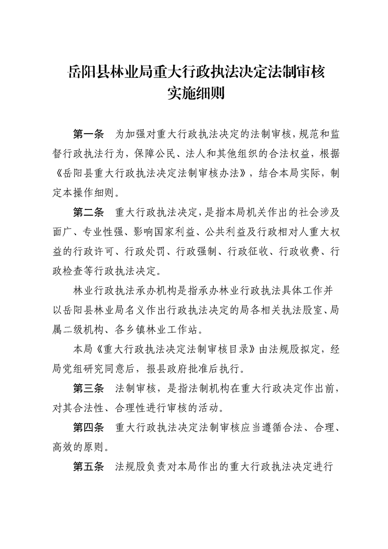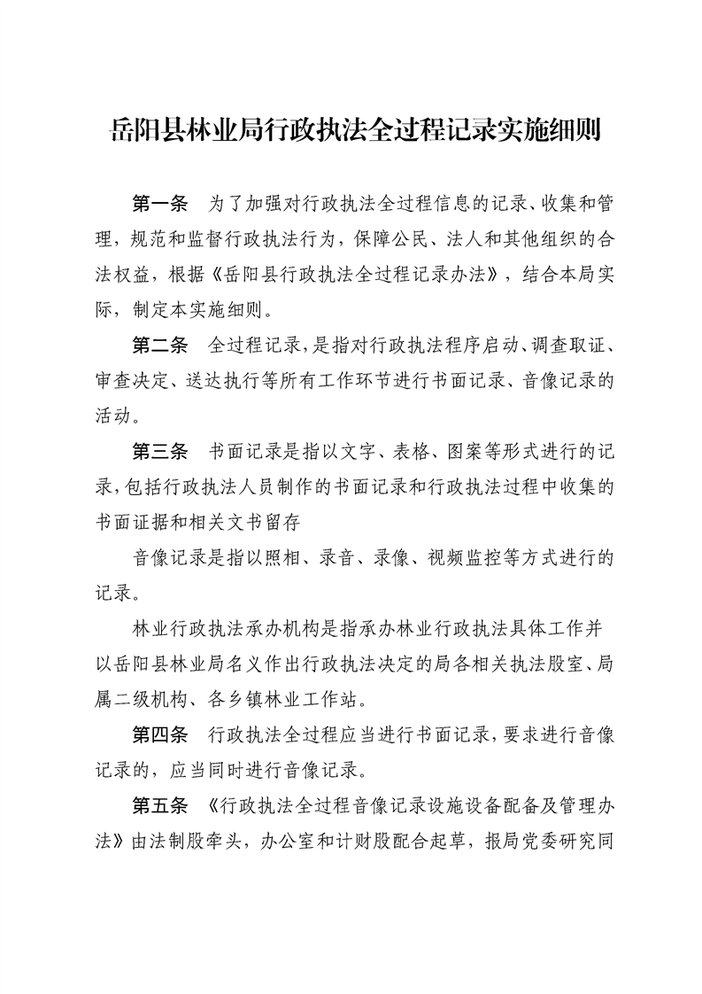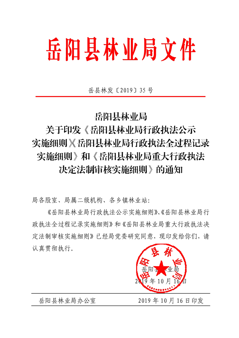 嶽陽縣林業局關於印發《嶽陽縣林業局行政執法公示實施細則》《嶽陽縣林業局行政執法全過程記錄實施細則》和《嶽陽縣林業局重大行政執法決定法製審核實施細則》的通知