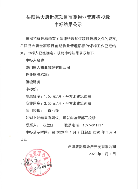 嶽陽縣大唐世家項目前期物業管理招投標中標結果公示