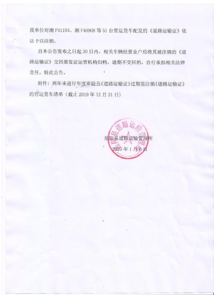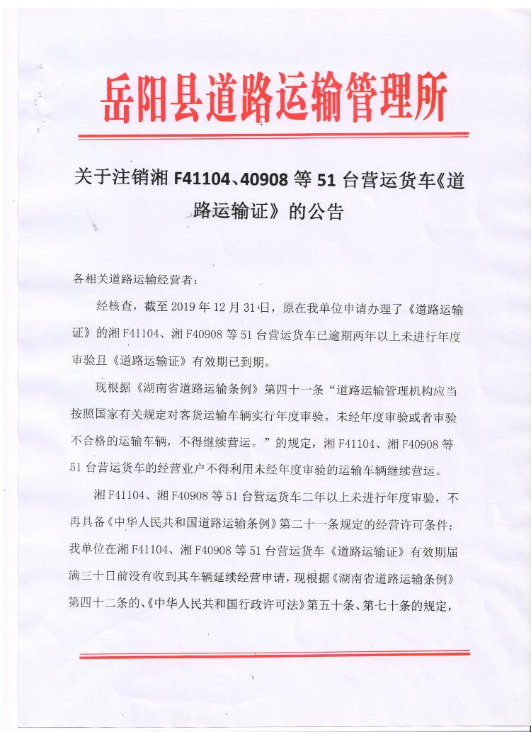 關於注銷湘F41104、40908等51台營運貨車《道路運輸證》的公告