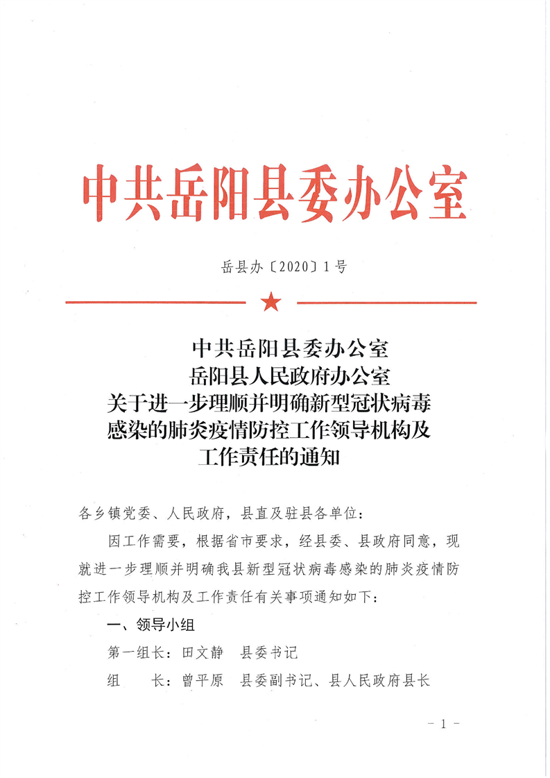 關於進一步理順並明確新型冠狀病毒感染的肺炎疫情防控工作領導機構及工作責任的通知