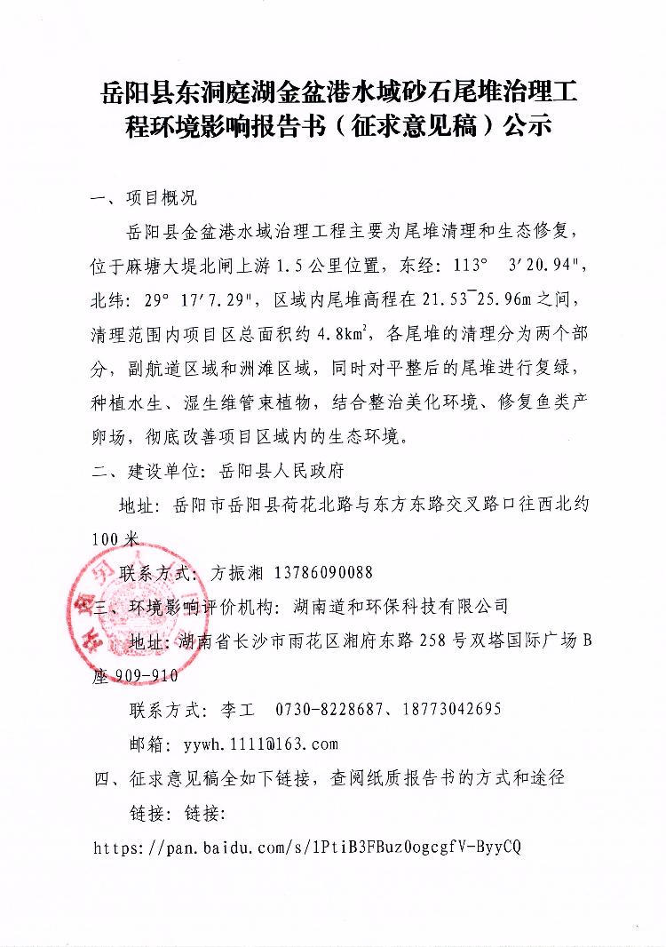 嶽陽縣東洞庭湖金盆港水域砂石尾堆治理工程環境影響報告書(征求意見稿)公示