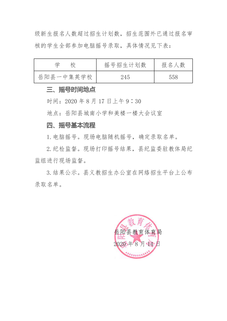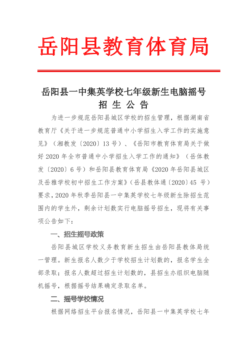 嶽陽縣一中集英學校七年級新生電腦搖號招生公告