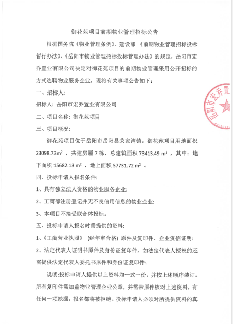 根據國務院《物業管理條例》、建設部《前期物業管理招標投標暫行辦法》、《嶽陽市物業管理招標投標管理辦法》的規定,嶽陽市宏喬置業有限公司決定對禦花苑小區的前期物業管理采用公開招標的方式選聘物業服務企業,現將有關事項進行網上公開公告。