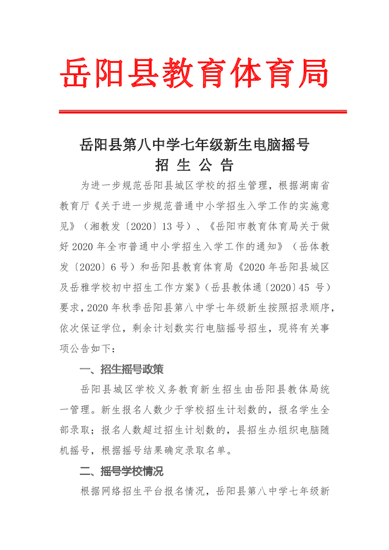嶽陽縣第八中學七年級新生電腦搖號招生公告