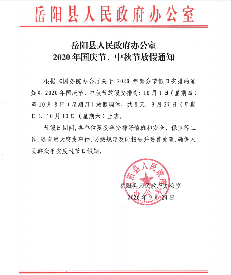 嶽陽縣人民政府辦公室2020國慶節、中秋節放假通知