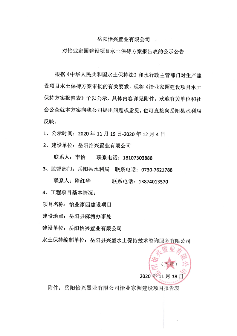 嶽陽怡興置業有限公司對怡興家園建設項目水土保持方案的公示