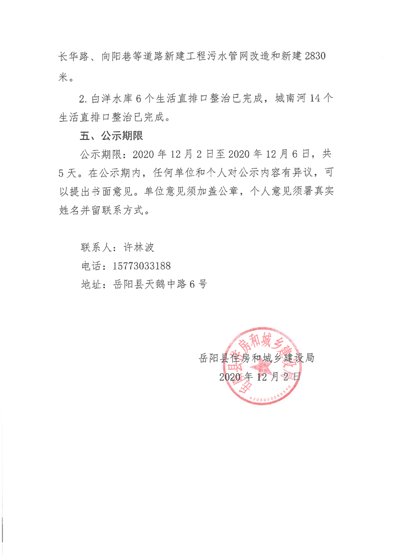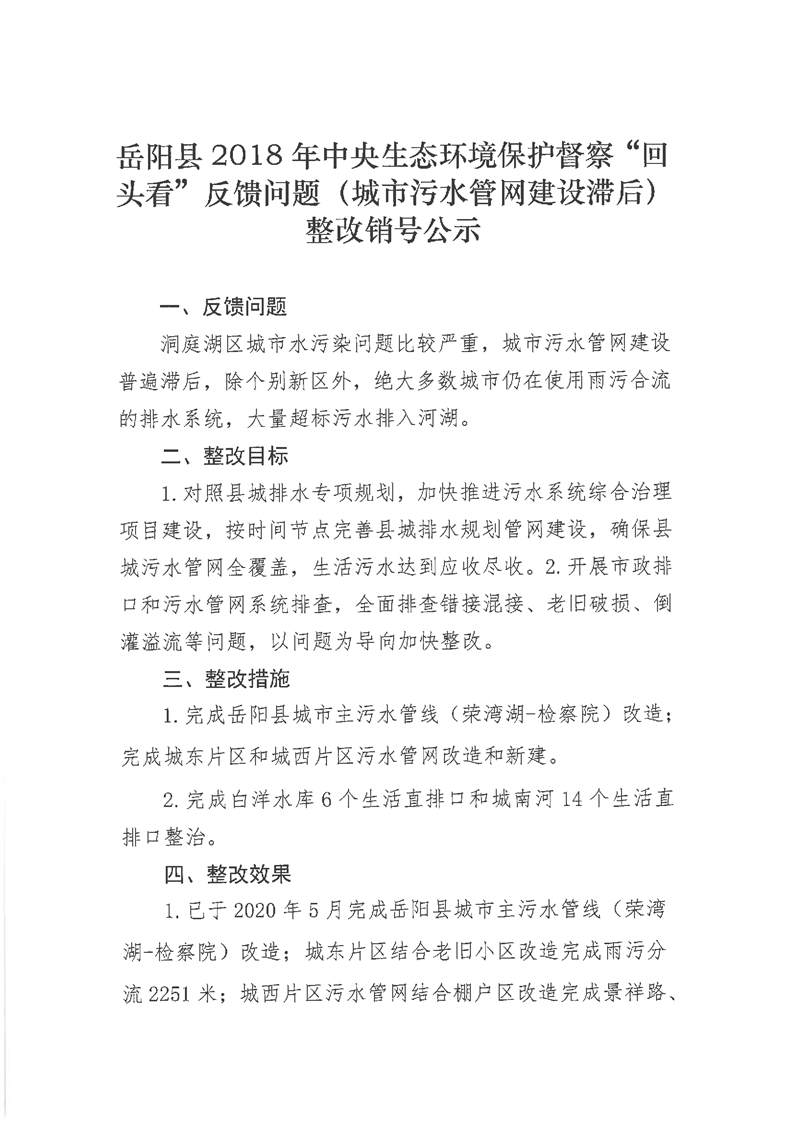 嶽陽縣2018年中央生態環境環保督察“回頭看”反饋問題(城市汙水管網建設滯後)整改銷號公示