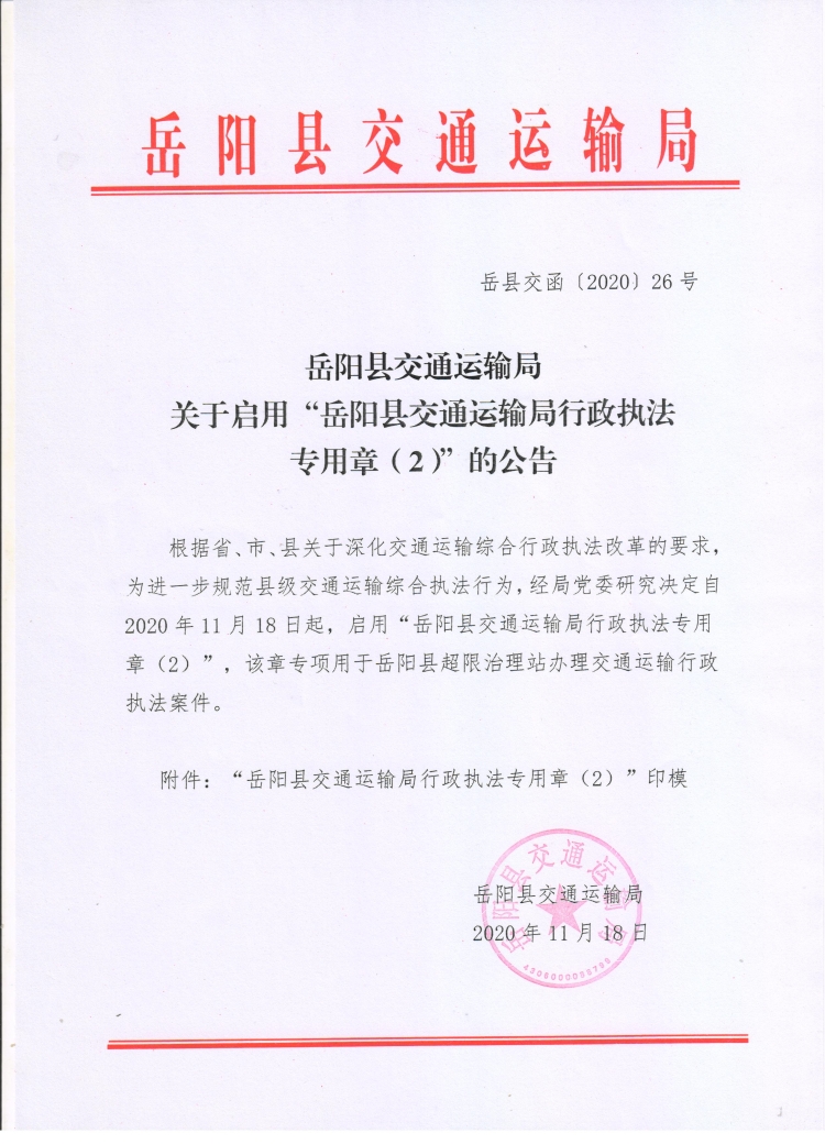 關於啟用“嶽陽縣交通運輸局行政執法 專用章(2)”的公告