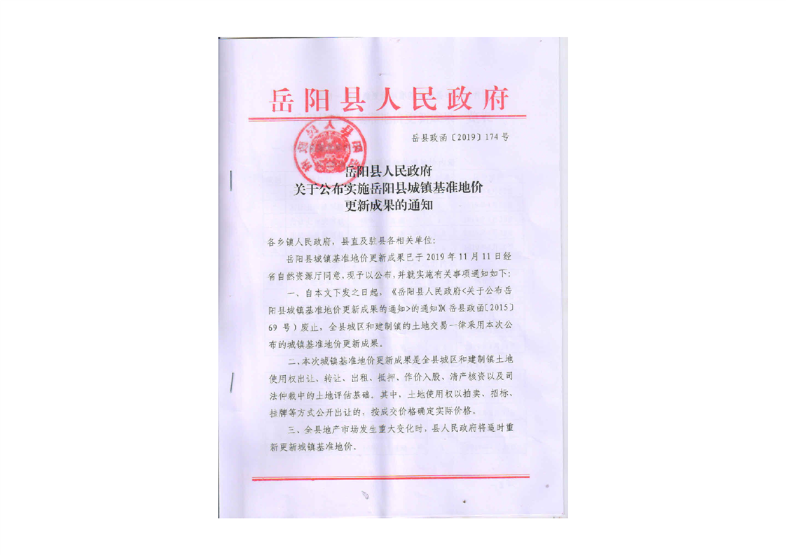 關於公布實施嶽陽縣城鎮基準地價更新成果的通知