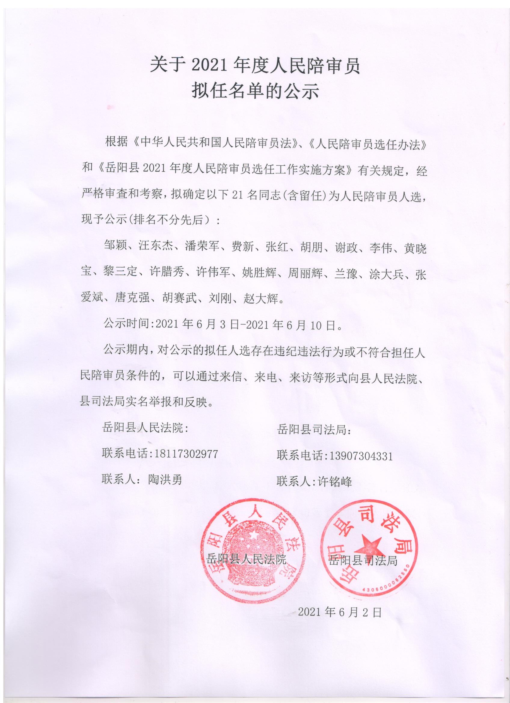 關於2021年度人民陪審員擬任名單的公示